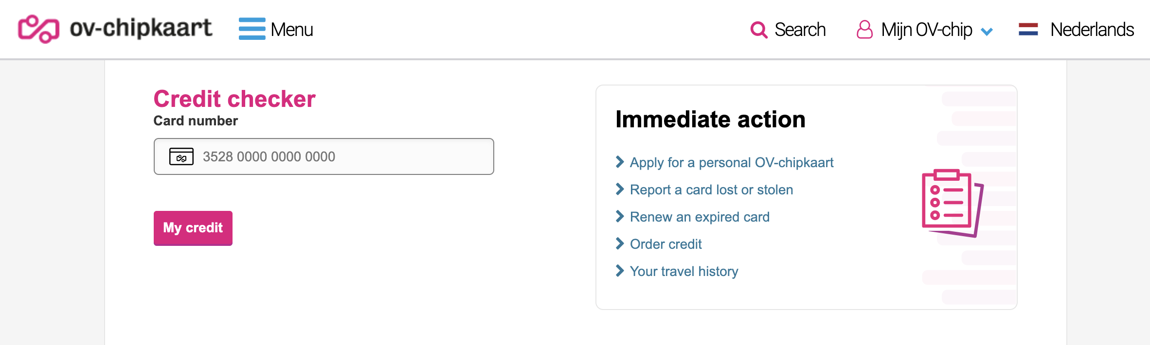 2. 첫 페이지에서 아래로 스크롤하면 아래 캡처파일과 같은 [Immediate action] 메뉴가 있는데 그 중 가장 위 Apply for a personal OV-Chipkaart를 클릭